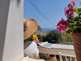 Questo appartamento presenta 1 camera da letto, 1 bagno, lenzuola, asciugamani, una TV a schermo piatto, una zona pranzo, una cucina con utensili e una terrazza con vista sul mare.